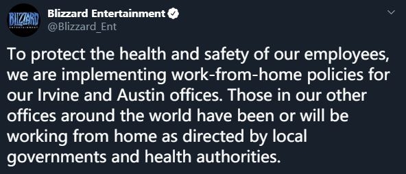 暴雪在刚刚发布的公告中称,为安全起见公司尔湾总部及奥斯汀分部全体职员在家办公;海外各单位须遵从当地公共卫生管制措施继续在家办公或考虑改为居家办公,基本上没人上班了。服务器以及各项游戏服务不会中断, 运维团队将在这段非常时期竭诚为大家提供最佳游戏体验。