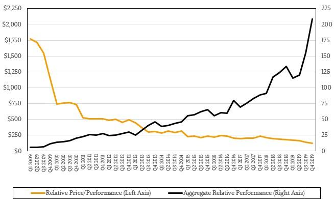 可以看到,在很大程度上由于英特尔和AMD在服务器CPU方面的竞争以及DRAM和闪存价格的下降,x86服务器的平均成本一直在下降。