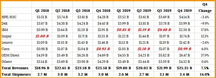 IDC估计,在第四季度,戴尔的销售额为39.9亿美元,下降了9.9%,从工厂运到渠道或客户的服务器为549,488台,下降了5.4%。HPE方面,包括其在中国的H3C合作伙伴的出货,HPE实现了4.7%的出货量增长,达到507,228台,获得了41.4亿美元的收入,下降3.4%,但这是HPE在本季度再次进入顶级服务器制造商行列,这距离上一次已经有一段时间了。