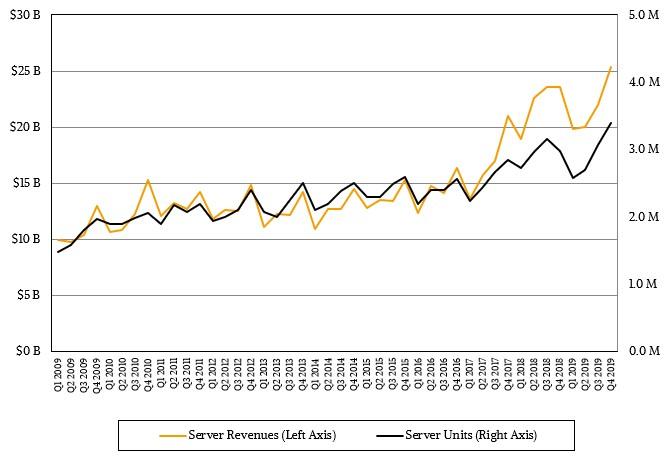 根据市场研究机构IDC的数据,距离上一次经济衰退开始已经过去了十二年时间,2019年第四季度,服务器出货量增长了14%,达到340万台,收入增长了7.5%,达到253.5亿美元。
