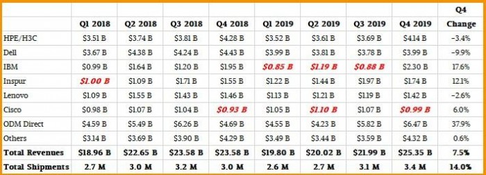 现在,如果对IDC的这些数字进行一些数学计算,就会发现,如果剔除ODM的影响,它们在2019年第四季度的销售总额中占25.5%,其余的服务器市场的收入十分平淡。这好于第二季度的收入下降了8%,第三季度的收入下降了6.6%,但不同是,IBM的System z15销售增加。