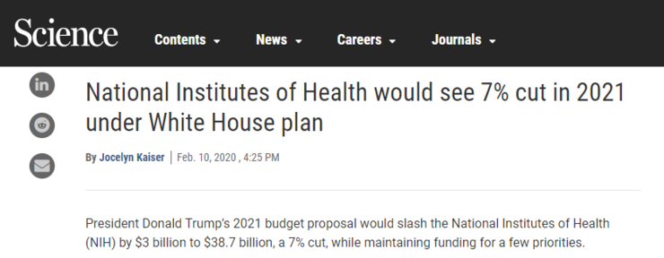 但与此同时,2021 财年预算提案也大幅削减了美国主要科研机构的经费预算,而且多为两位数的削减——而这也是 Donald Trump 连续第 4 年提议大幅削减联邦科研经费,引起了学界不满,当时 Science News 也报道了这一提案。