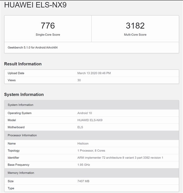 3月14日消息,华为P40 Pro现身GeekBench跑分网站。它搭载的是麒麟990 5G SOC,单核成绩为776,多核成绩为3182,运行Android 10系统,配备8GB内存。该机将于3月26日发布,当前有关P40 Pro的部分信息已经揭晓。