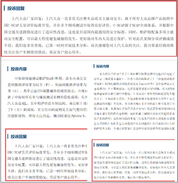 此前,针对帕萨特中保研25%偏置碰撞不佳,上汽大众厂家在车质网上回复称:上汽大众一直非常关注整车品质及主被动安全,旗下所有大众品牌产品按照中国C-NCAP五星评价标准开发,并在多个细项测试中取得良好评价。C-NCAP源于NCAP全球体系,并根据中国交通及道路情况进行了适应性改进,这也是目前国内最通用的安全标准。同时,帕萨特配备多项主被动安全配置,可以最大程度避免碰撞的发生,更好地对车内人员进行保护。针对此次某细分项评测成绩不佳,我们也非常重视,已第一时间开展技术分析,再次感谢您对上汽大众的关注。我司要求经销商继续关注客户车辆使用情况,保证客户放心用车。