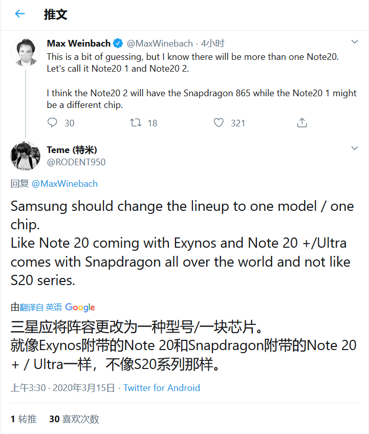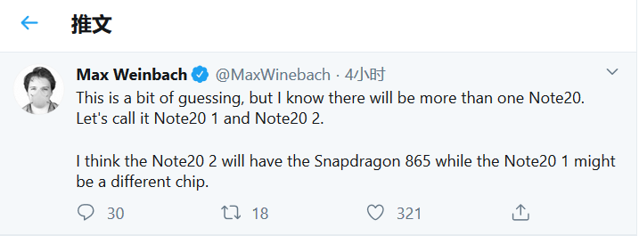 爆料人Max Weinbach指出,他获悉Note 20至少有两款,Note 20 1和Note 20 2。其中Note 20 2搭载骁龙865,Note 20 1搭载另一款芯片。