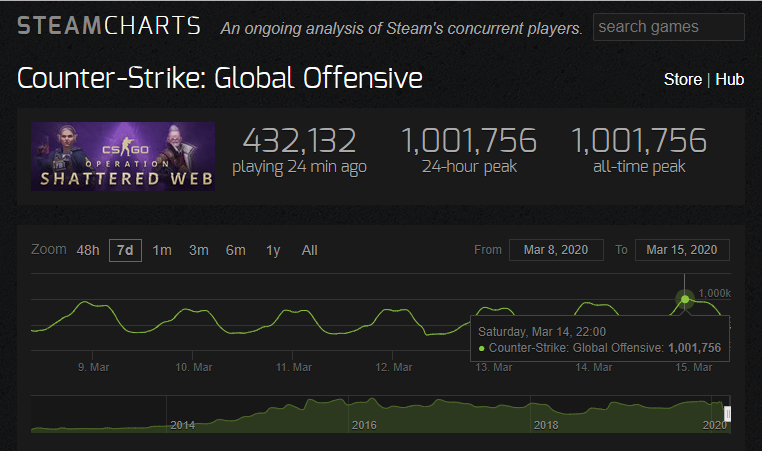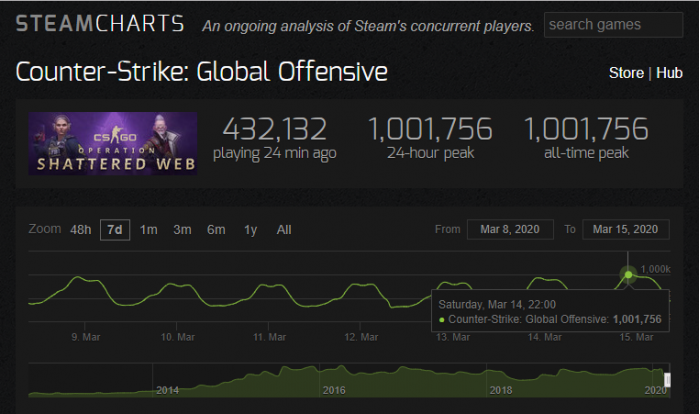 借由新冠肺炎疫情导致的全球范围居家隔离之势,Steam等各大平台的玩家在线数量都有所飙升。V社的看家作品《CS:GO》更是在上架近八年后,同时在线玩家峰值数首次突破百万大关。