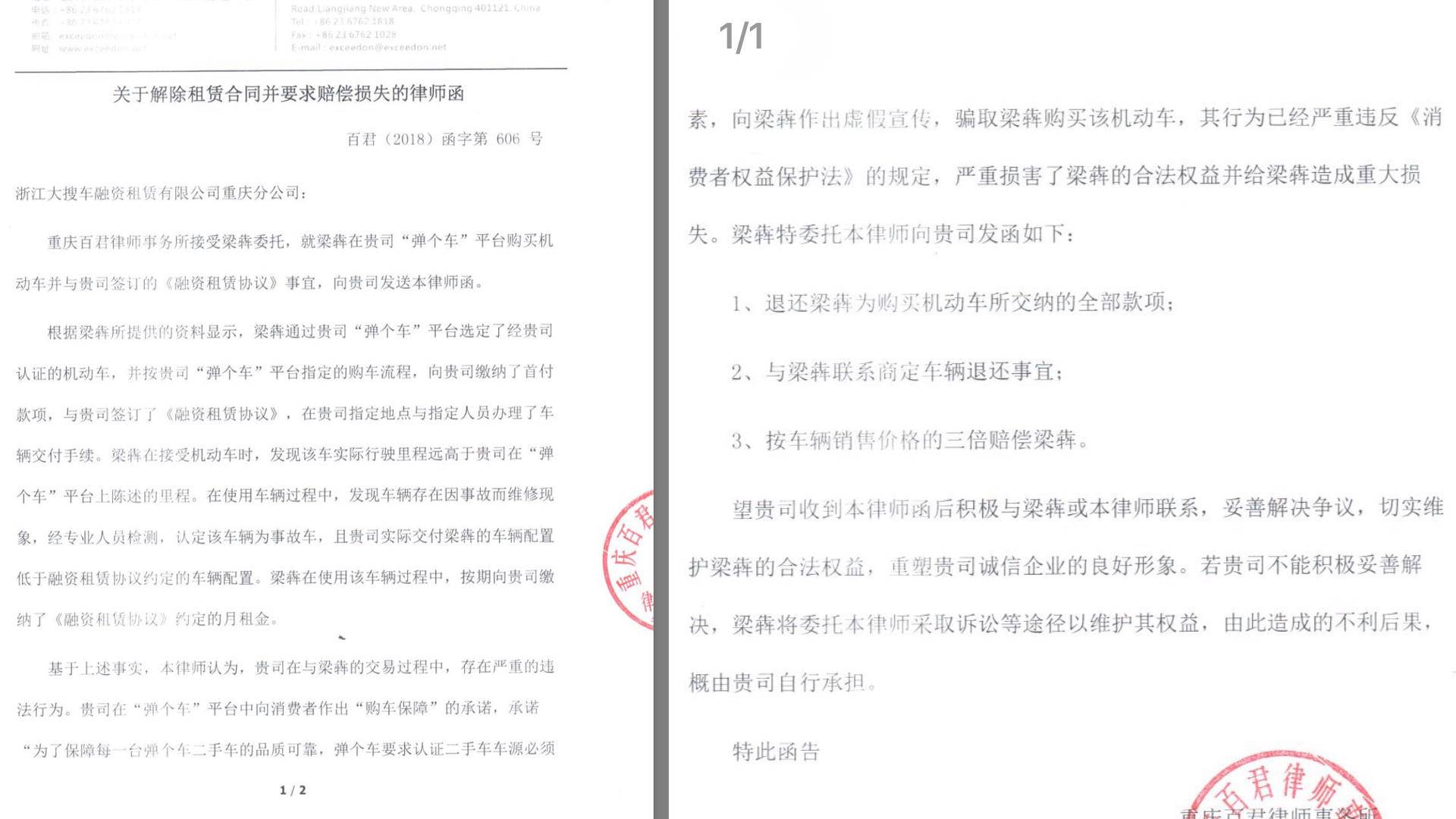 2018年12月,梁犇咨询律师后得到的说法是“按照《消费者权益保护法》可以要求对方三倍赔偿。”随后,他通过百君律师事务所向大搜车发去律师函,提出三个要求:退款,退车,按照购车价格三倍赔偿。“我在质量万里行投诉车辆属于事故车之后,他们来检测过,承认了是事故车。”梁犇说,这也是他提出要求的依据之一。
