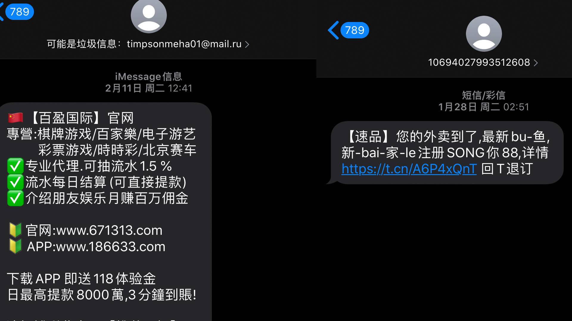 “虽然iMessage的垃圾短信这两年的确少了点,但博彩相关的内容依然是主流,也经常见。”一位iPhone用户李维告诉凤凰网科技,除此以外,他也能偶尔收到“超A货仿制名牌”等信息。