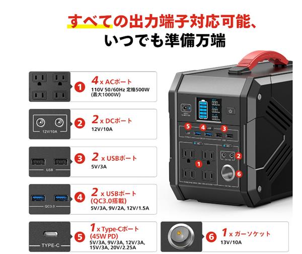接口方面,它支持4个AC输出,额定500W输出,2个DC直流输出,12V/10A规格,有2个USB接口,支持5V/3A,还有2个USB QC 3.0接口,支持5V/3A、9V/2A、12V/1.5A。