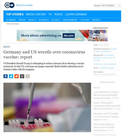 《德国之声》15日援引德国《星期日世界报》(Welt am Sonntag)报道称,该国CureVac公司正研制新型冠状病毒疫苗,而德国政府和美国政府正在为此争执不休。