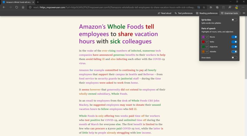 基于Chromium的Edge浏览器不断被微软赋予更多的功能,在Canary通道发布的最新版本v82.0.453.0中微软引入了全新的语法工具。这款工具能够帮助用户识别例如名词、动词等词性,并可以对网页进行分析以高亮突显所选的词性。