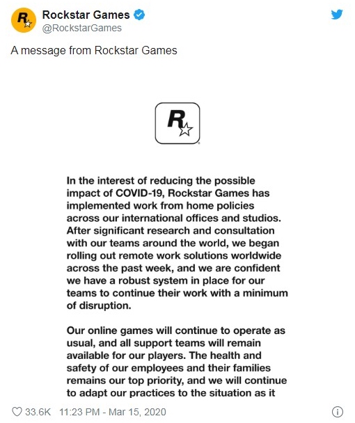 “为减少COVID-19的影响,R星已在全球各工作室实行在家远程办公。经过深入研究和咨询,我们在过去一周逐步开展远程办公。我们有一套完善系统,能让旗下团队继续工作,并且所受干扰为最低。