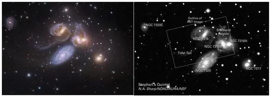 图1:著名的致密星系群---斯蒂芬五重奏的图像。除了最下方的NGC 7320是无关的前景星系外,该星系群由中间的三个星系(NGC 7319, NGC 7318A, NGC 7318B)和左上角的NGC 7320C及右下角的NGC 7317共同构成