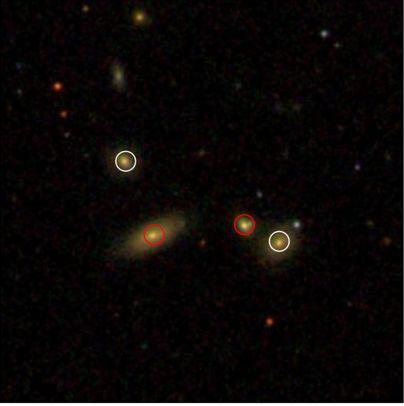 图2:一个典型的结合斯隆数字巡天和郭守敬望远镜巡天数据证认的致密星系群。其中白色圈出来的星系是由斯隆数字巡天提供的光谱观测,红色圈出来的星系光谱则是由郭守敬望远镜巡天提供