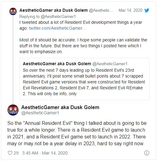 著名爆料人Dusk Golem在推特上发文称,《生化危机》系列将以年货形式推出新作,2021年有一款新作,2022年还将有新作发售,2023年或空缺一年。M-Two开发团队将负责制作2022年的《生化危机》系列新作,但这款新作是啥内容不得而知。