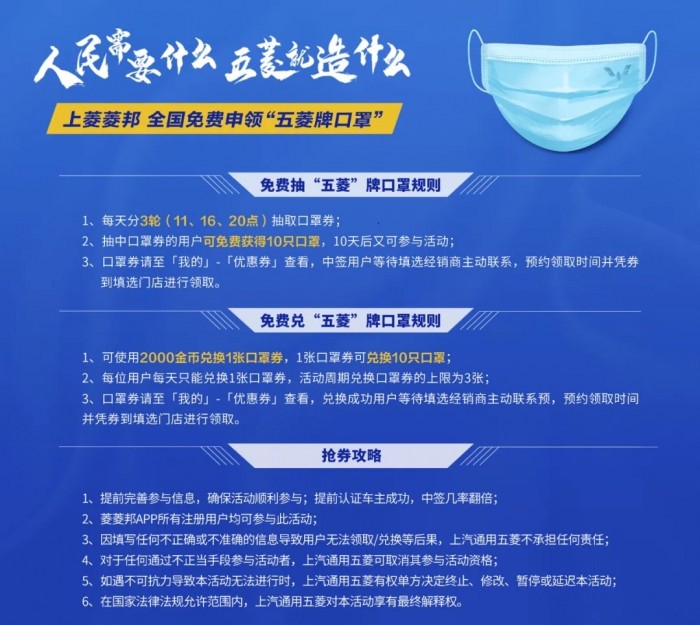 其中,免费抽取部分,全国每天将有10000名用户能够免费抽中五菱牌口罩,每人10只,共计每天10万只;“金币”兑换部分,只要在“菱菱邦”APP拥有一定数量的虚拟金币,就可免费兑换对应的口罩。