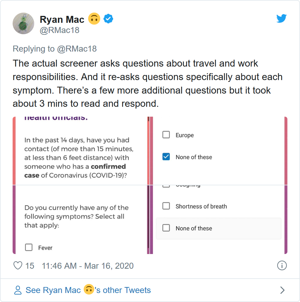 该网站的第一个问题是:“您目前是否有严重咳嗽、呼吸短促、发烧或其他相关症状?”如果回答“是”则就会被告知这个项目“不合适”,需要寻求医疗救助;如果回答“不”则将被要求使用谷歌帐户登录并签署一份知情同意授权表格。该表详细说明了其数据可能会共享给公共卫生官员。之后会被引导接受一系列关于其症状的筛查问题环节: