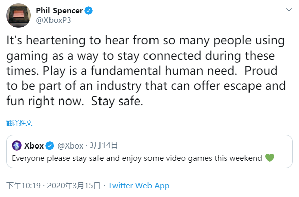 微软Xbox老大兼游戏业务副总裁Phil Spencer就在推特上感叹道:“如此多人在当下使用游戏作为保持社交联系的一种方式,这令人感到振奋。玩乐是人类最基本的需求之一,游戏行业在疫情环境下能够提供庇护和乐趣,作为行业内的一份子我感到十分自豪。记住,安全第一。”