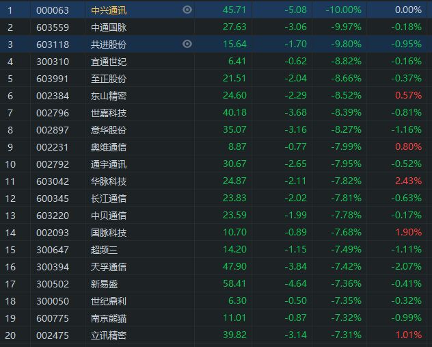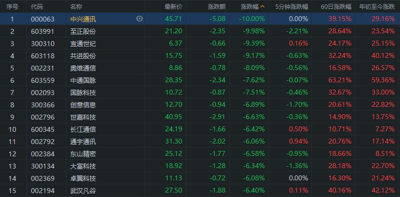 5G概念股中,中通国脉、共进股份逼近跌停,宜通世纪、至正股份、东山精密、世嘉科技、意华股份等跌幅在8%以上。
