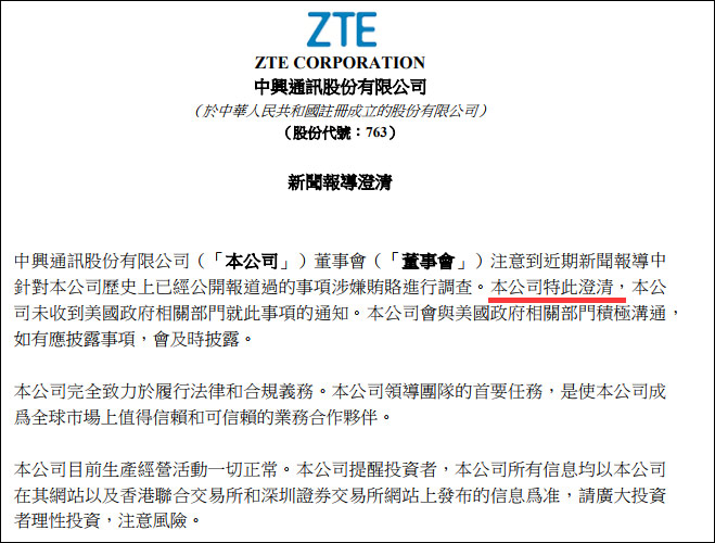 3月16日中午12时54分,中兴通讯在港交所发布澄清公告:其董事会注意到近期新闻报道中针对其历史上已经公开报道过的事项涉嫌贿赂进行调查,该公司未收到美国政府相关部门就其涉嫌贿赂进行调查的通知。