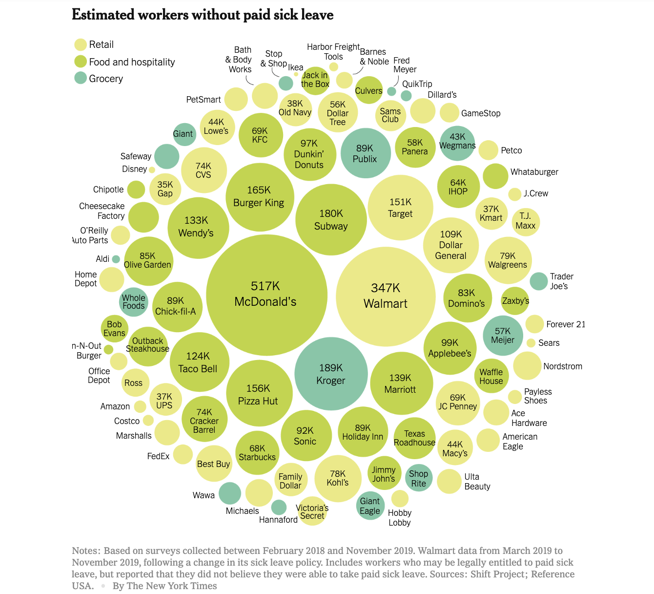 然而根据民主党和共和党都提出的这套国会援助计划,数百万美国人可能没有能力做出这样的选择。据了解,该法律提案将雇员人数超过500人的公司排除在国会援助计划之外。《纽约时报》率先报道了这一消息,以下由其发布的图表显示了美国有多少公司没有实施带薪病假政策。
