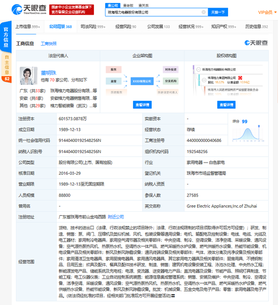 珠海格力电器股份有限公司成立于1989年12月,注册资本约为60亿,法定代表人为董明珠,经营范围包括研发、制造、销售:泵、阀门、压缩机及类似机械,风机、包装设备等通用设备等。天眼查十大股东信息显示,高瓴资本持股15.00%,为该公司最大股东。