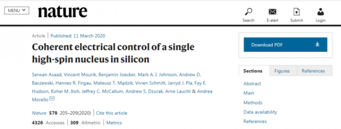 58 年后,核磁共振先驱的设想终于得到了印证。当地时间 2020 年 3 月 11 日,《自然》杂志(Nature)刊登了澳大利亚新南威尔士大学(The University of New South Wales,UNSW)量子工程科学教授 Andrea Morello 团队一篇名为 Coherent electrical control of a single high-spin nucleus in silicon(硅中单个高自旋核的相干电控制)的论文。