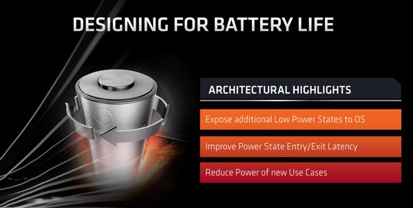 针对音频,AMD推出了ACP(Audio Controlller)功能,因为一些语音识别助手,比如微软的Cornata、亚马逊的Alexa,它们是需要常驻后台的,但又不能因为它们一直保持全速状态,需要保持低功耗但又能及时响应,AMD这个功能开启后能节省20%的功耗。