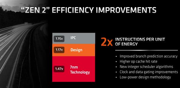 AMD表示锐龙4000处理器中每单元的能效比提升一倍,其中7nm工艺带来了1.47x的提升,IPC贡献了1.15x的提升,设计带来了1.17x的提升。