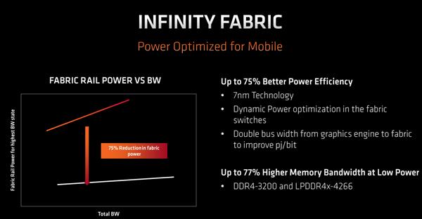 在Ifinity Fabric总线上,AMD也降低了每带宽的能耗,先进的7nm工艺、动态功耗优化实现了75%的能效提升,低功耗下带宽提升了77%。