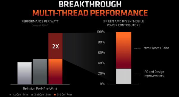 在多线程性能上,锐龙4000处理器实现了2倍的每瓦性能比,其中25%左右的贡献来自IPC及设计优化,75%左右都是来自7nm工艺。
