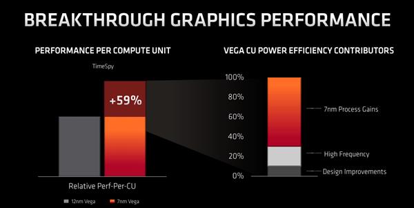 不过Vega架构GPU在7nm工艺上也获得了重生,AMD不仅改进了性能,还用各种手段提升了能效,CU单元减少的同时提升了25%的峰值频率,带宽也增加了77%。