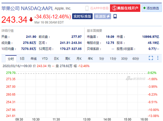 3月16日晚间消息,美股开盘,苹果大跌超12%,报243.34美元,市值下降到10996.97亿美元。今日法国竞争、消费和反欺诈总局(DGCCRF,以下简称“法国竞争总局”)宣布,对苹果公司的反垄断行为处以11亿欧元(约合12.3亿美元)的罚款。