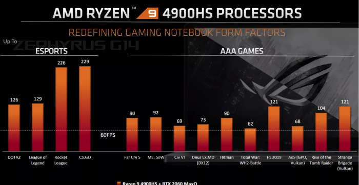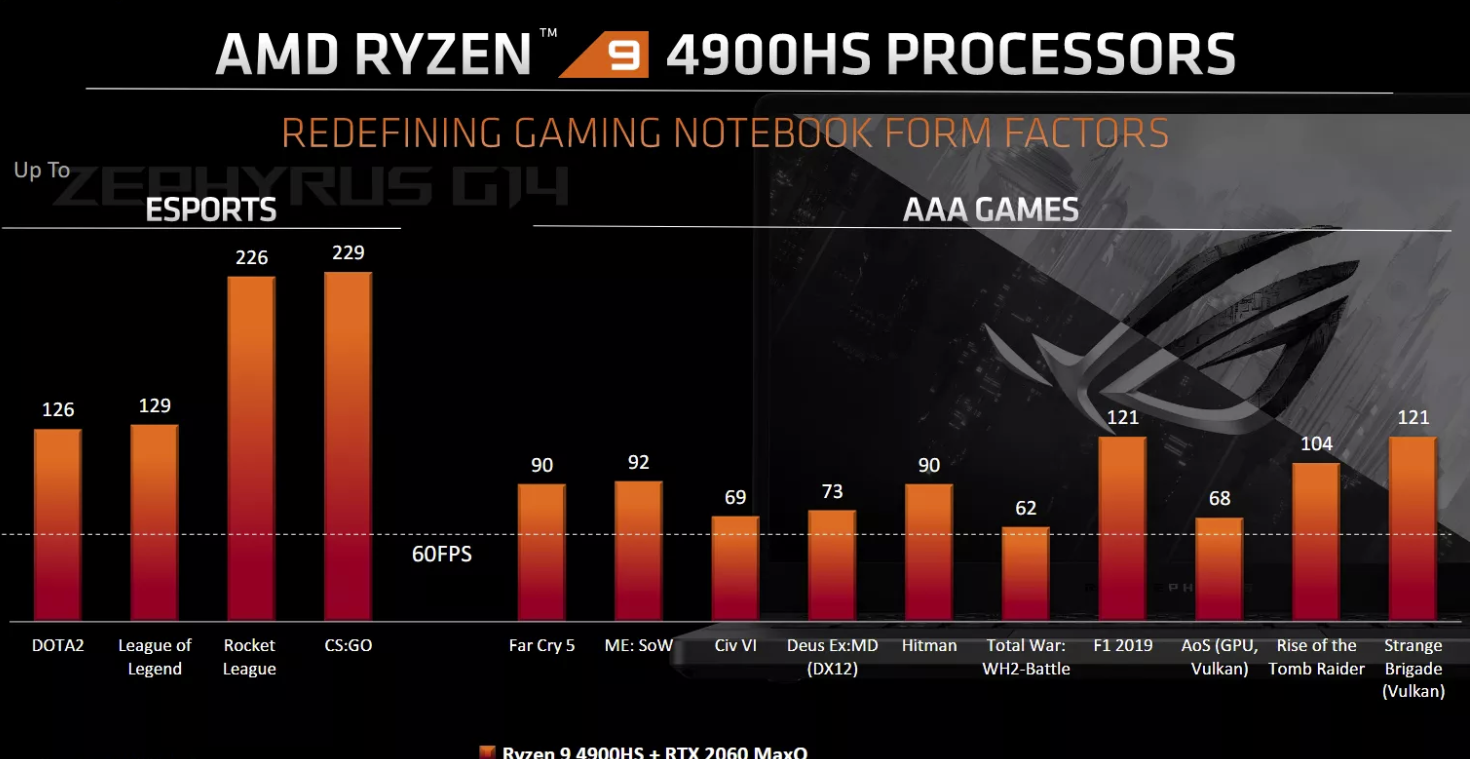 AMD还声称4900HS与Nvidia RTX 2060 Max-Q GPU搭配使用时,在许多AAA游戏中帧率每秒可以超过60帧,包括《古墓丽影:崛起》(104 FPS),《杀手》(90 FPS)和《孤岛惊魂5》(90 FPS)。