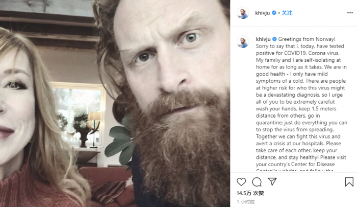 克里斯托弗海维尤通过自己的社交媒体公布了确诊消息。他透露自己已被检查出COVID19和Corona病毒阳性,并且和家人在自家中隔离。虽然已感染病毒,但是他仍然不忘激励粉丝对抗这次疫情。甚至建议大家勤洗手、与他人保持距离等尽量阻止病毒扩散传播和挤兑医疗资源。