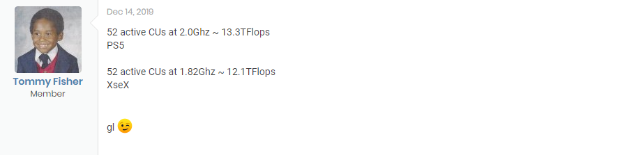 当时的爆料者@Tommy Fisher(现在被论坛ban了,理由是他的各种次世代爆料缺乏依据)在12月参与论坛讨论时间断性的提到了Xbox Series X和PS5的技术规格,其中就包括了双方的GPU性能: