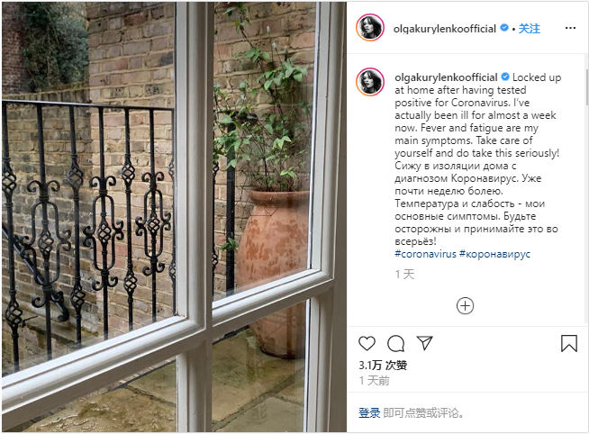 Kurylenko 表示自己出现症状已有一周,目前正在家中接受隔离,并敦促粉丝们也“认真对待”,主动宅家抗击新冠病毒疫情。