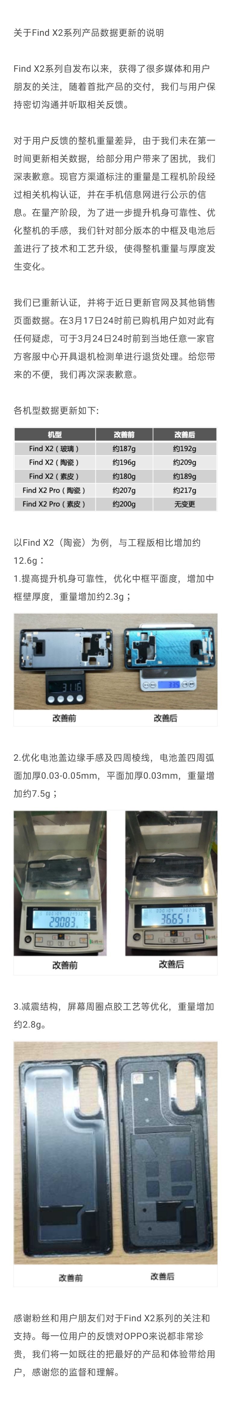 今天下午,OPPO客服官方微博发出了针对此事的回应。回应称,Find X2系列除素皮版之外,其余版本的重量确实和官网以及工信部标注的不一样。