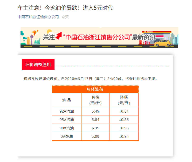 据中国石油浙江销售分公司消息,根据发改委调价通知,自2020年3月17日(周二)24:00起,汽柴油价格均下调。