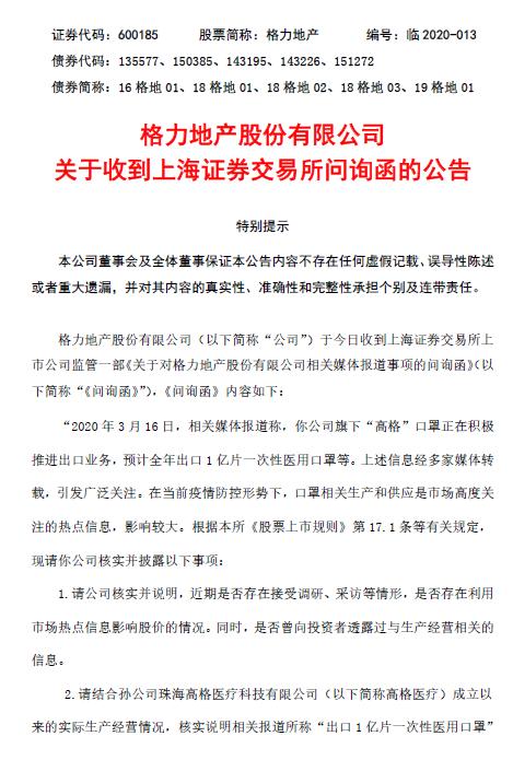 格力地产近期收到上海证券交易所问询函。《问询函》提到,2020年3月16日,相关媒体报道称,格力地产旗下“高格”口罩正在积极推进出口业务,预计全年出口1亿片一次性医用口罩等。上述信息经多家媒体转载,引发广泛关注。在当前疫情防控形势下,口罩相关生产和供应是市场高度关注的热点信息,影响较大。