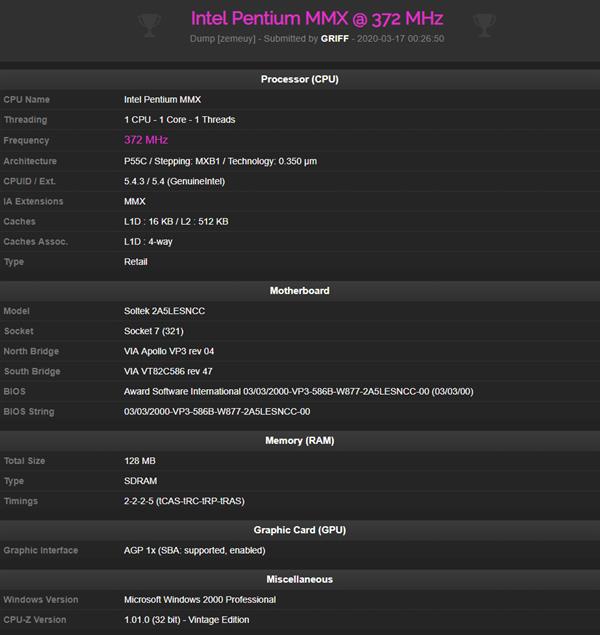 普通人很难理解超频高玩折腾超频有什么意义?整天跑分有用吗?没用,但是很有意义。超频玩家GRIFF今天就创造了一个奇迹,它将Intel经典处理器奔腾MMX处理器超频到了372MHz,提升幅度超过124%,后者默认频率只有166MHz。