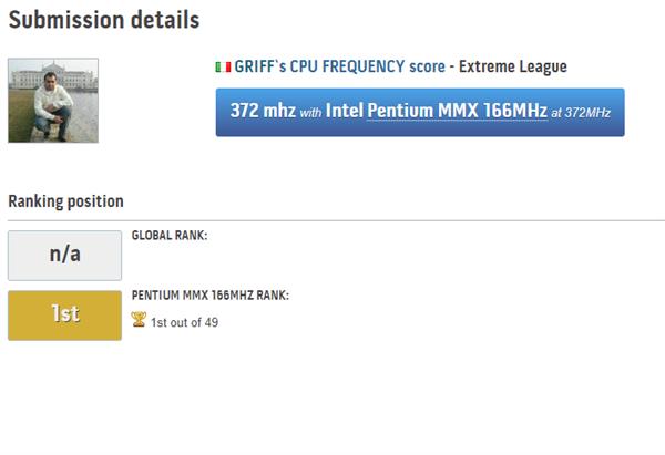 GRIFF现在是奔腾MMX处理器超频新冠军,比第二名的350MHz高出了22MHz,不知道还有没有人能再次挑战新纪录,来个400MHz?