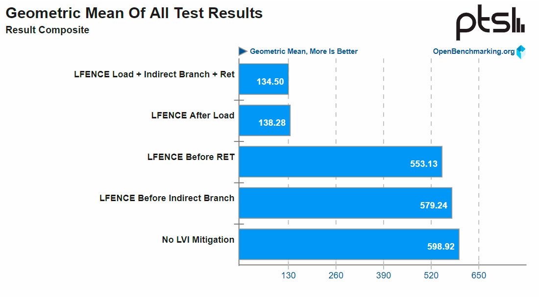 Phoronix找了一颗至强E3-1275 v6(Kaby Lake),在Linux环境下进行了测试,包括未打补丁、分支预测前载入LFENCE、RET指令前载入LFENCE、载入后执行LFENCE、同时载入LFENCE/RET/分支预测。