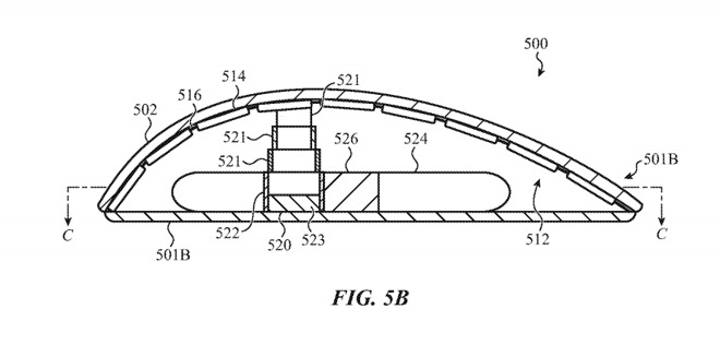该专利描述了鼠标如何具有包含铰接构件的外壳,其顶部的外表面用于放置用户的手掌。致动器包含在外壳内,该致动器附接到铰接构件,从而在不同位置之间推动和拉动鼠标。通过铰接外壳,可以调节曲率和高度以满足用户的喜好,这也可以使鼠标更薄,从而使其比普通的圆形鼠标更易于存储和运输。