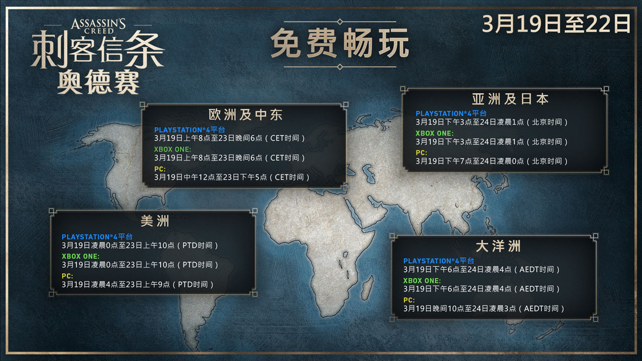 《刺客信条:奥德赛》免费游玩活动对应PC(Uplay和Epic)、PS4和XboxOne全部三个平台,届时请前往对应的数字分发渠道免费下载。PS4和XboxOne版将于19日15点开始到24日1点结束,PC版则从19日19点开始,到24日0点结束。XboxOne版本需要Xbox Live金会员。