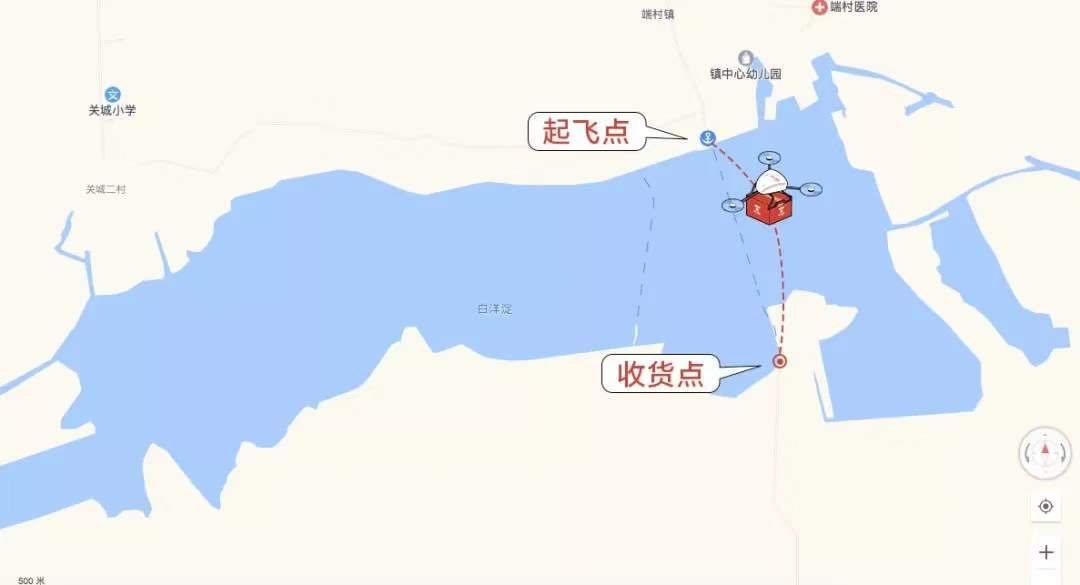 由于白洋淀轮渡停航,配送员绕行就要花费 6 小时,有了京东物流这条空中运输线,从起飞到收货全程仅用十几分钟