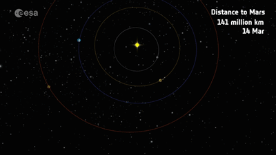 每当火星相对于太阳的位置领先于地球44度角左右的时候,从地球发射的探测器经过一个椭圆轨道(也就是“地火转移轨道”)后刚好会在几个月后与火星自然相遇,这样的时机每26个月出现一次。注意,这样的发射时机并不对应于火星距离地球最近的时刻。