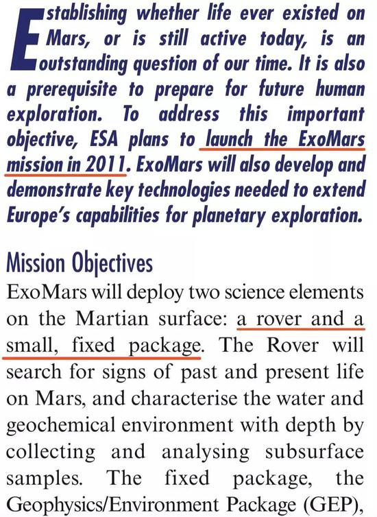 ExoMars任务起初获批于2005年,是欧空局“曙光女神计划”(Aurora programme)(相当于是欧空局的“旗舰级”任务)的一部分,只有简单的火星车+着陆器(固定站),计划使用俄罗斯的联盟号火箭,于2009年发射。对,那时候叫ExoMars 2009,火星车只有120公斤,科学仪器只有10公斤。为了和当时已经在火星上的NASA勇气号和机遇号火星车有所区分,欧空局早早就已经决定把ExoMars的探测重点定为NASA没有涉及到的地外生物方向。