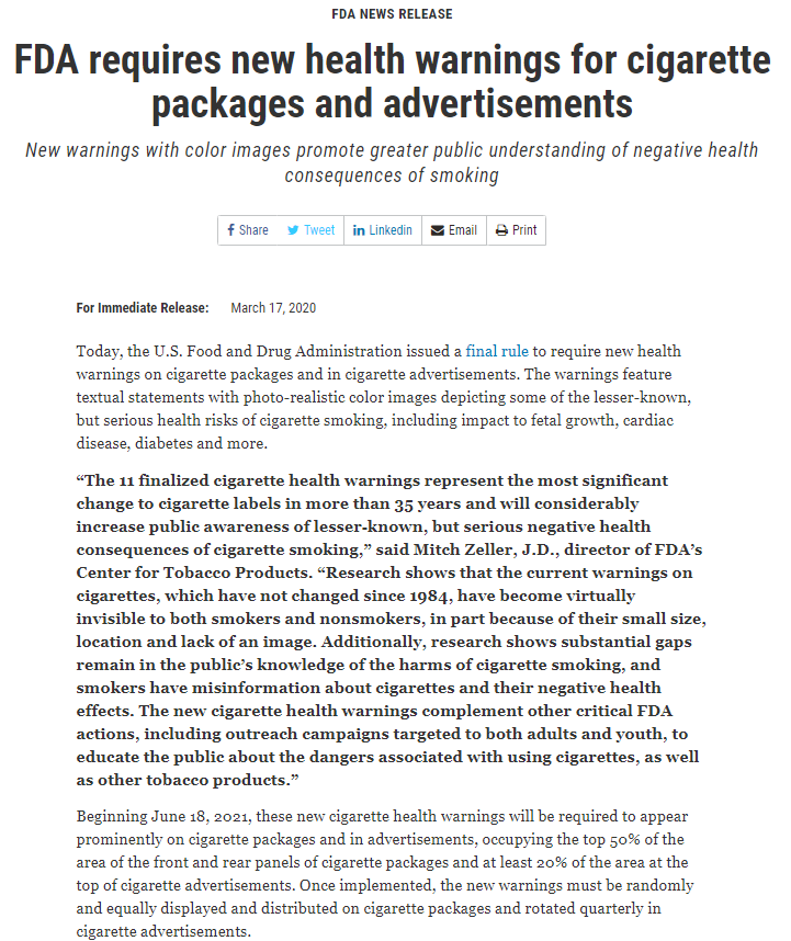 FDA周二透露,它已经发布了最终规则,将迫使香烟制造商在其卷烟包装和相关广告上加入新的危害警告。这些警告将包括彩色的逼真图像,这些图像描述了一些鲜为人知的吸烟后果,包括胎儿生长问题和糖尿病等。