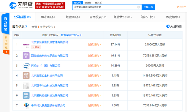 天眼查股东信息显示,紫光展锐股权结构目前仍以紫光系为主,其中公司大股东为北京紫光展讯投资管理有限公司,持股57.14%,第二大股东为西藏紫光新微电子投资有限公司,持股16.81%,第三大股东为英特尔(中国)有限公司,持股14.29%。